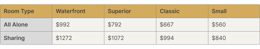| Room Type | Waterfront | Superior | Classic | Small |